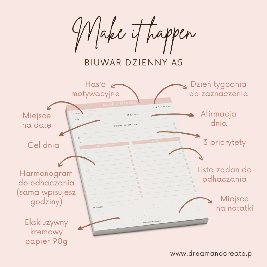 DREAM & CREATE to marka, która powstała zainspirowana kobietami takimi jak Ty. I to właśnie dla takich cudownych kobiet chcę tworzyć idealne narzędzia! Moją misją jest wspieranie Cię w rozwoju osobistym, a celem pomoc w realizowaniu Twoich marzeń.